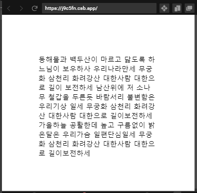"동해물과 백두산이 마르고 닳도록 하느님이 보우하사 우리나라만세 무궁화 삼천리 화려강산 대한사람 대한으로 길이 보전하세 남산위에 저 소나무 철갑을 두른듯 바람서리 불변함은 우리기상 일세 무궁화 삼천리 화려강산 대한사람 대한으로 길이보전하세 가을하늘 공활한데 높고 구름없이 밝은달은 우리가슴 일편단심일세 무궁화 삼천리 화려강산 대한사람 대한으로 길이보전하세";