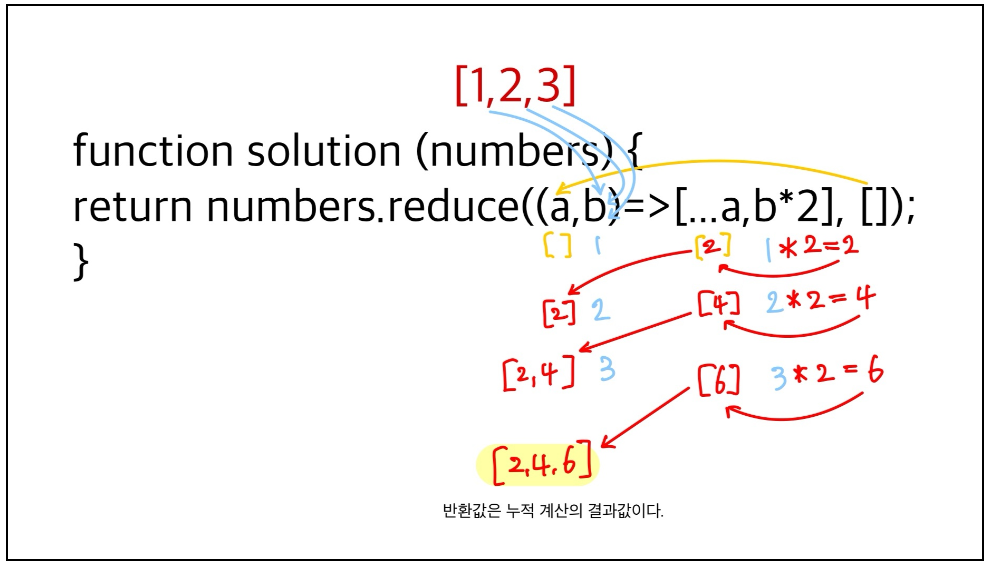 1. reduce 함수를 사용하여 배열 numbers를 반복하는데, 초기값으로 빈 배열 []을 사용한다.