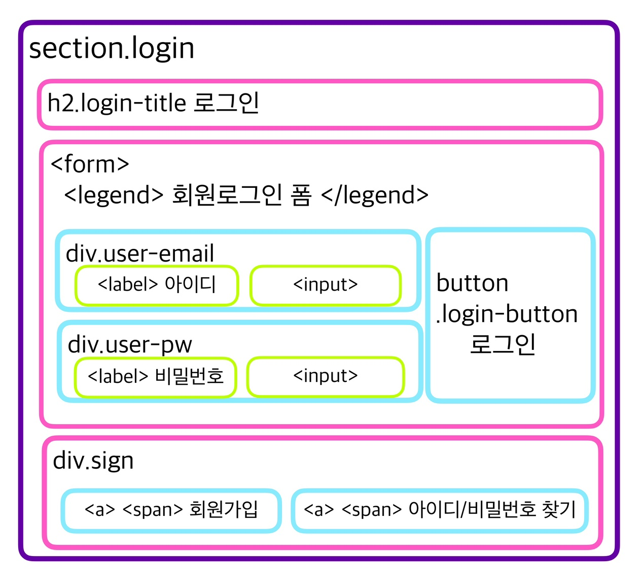 <form>, <fieldset>, <legend>, <label>, <input>, <button>, <a> 을 사용한 로그인 섹션 예시