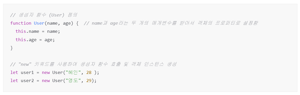 예를 들어, User 생성자 함수를 사용하여 user1과 user2라는 두 개의 객체 인스턴스를 생성했다.
