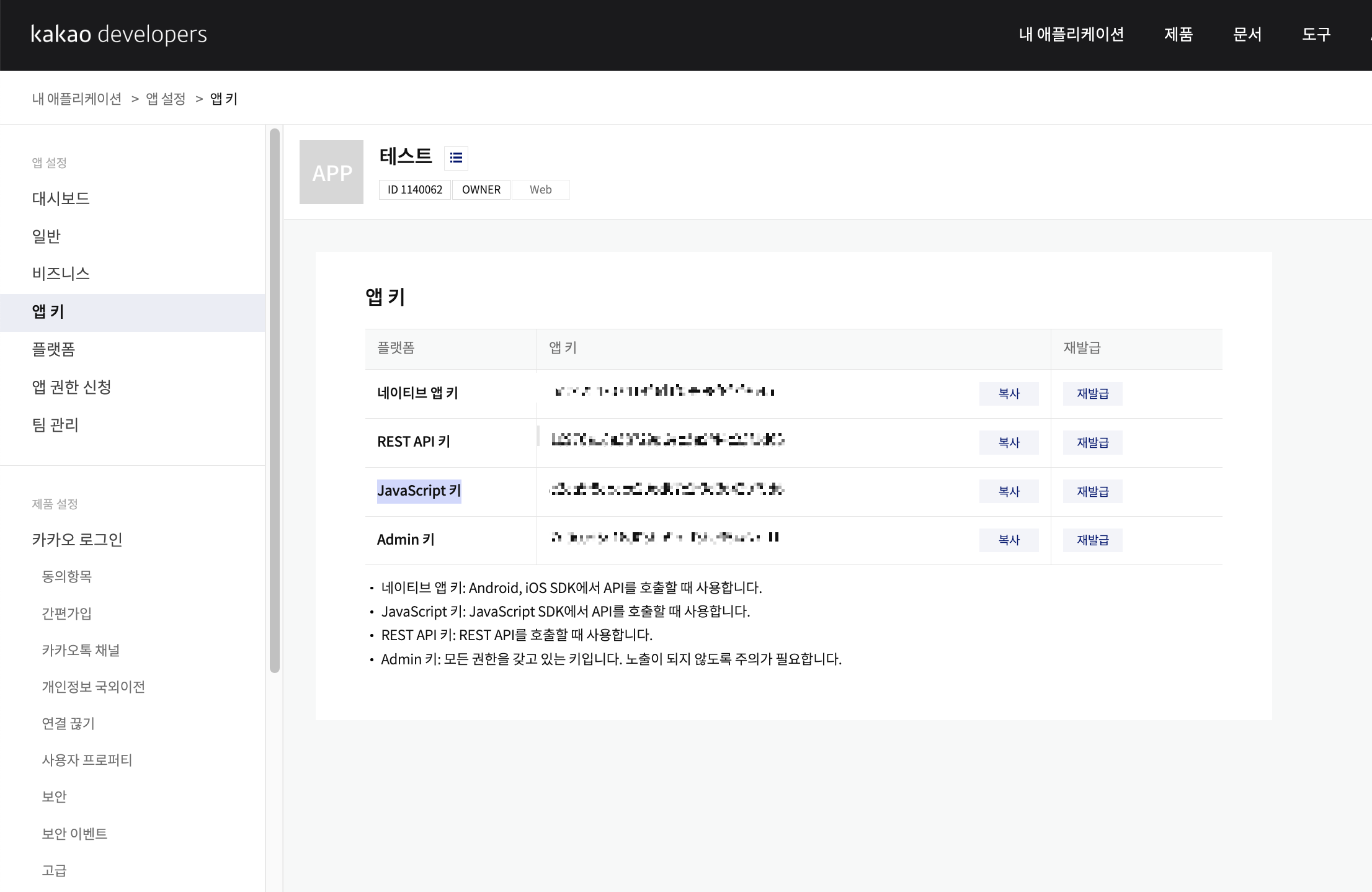 "내 애플리케이션 → "테스트"(아까 본인이 정보 입력해서 만든 앱) → 앱 키"
