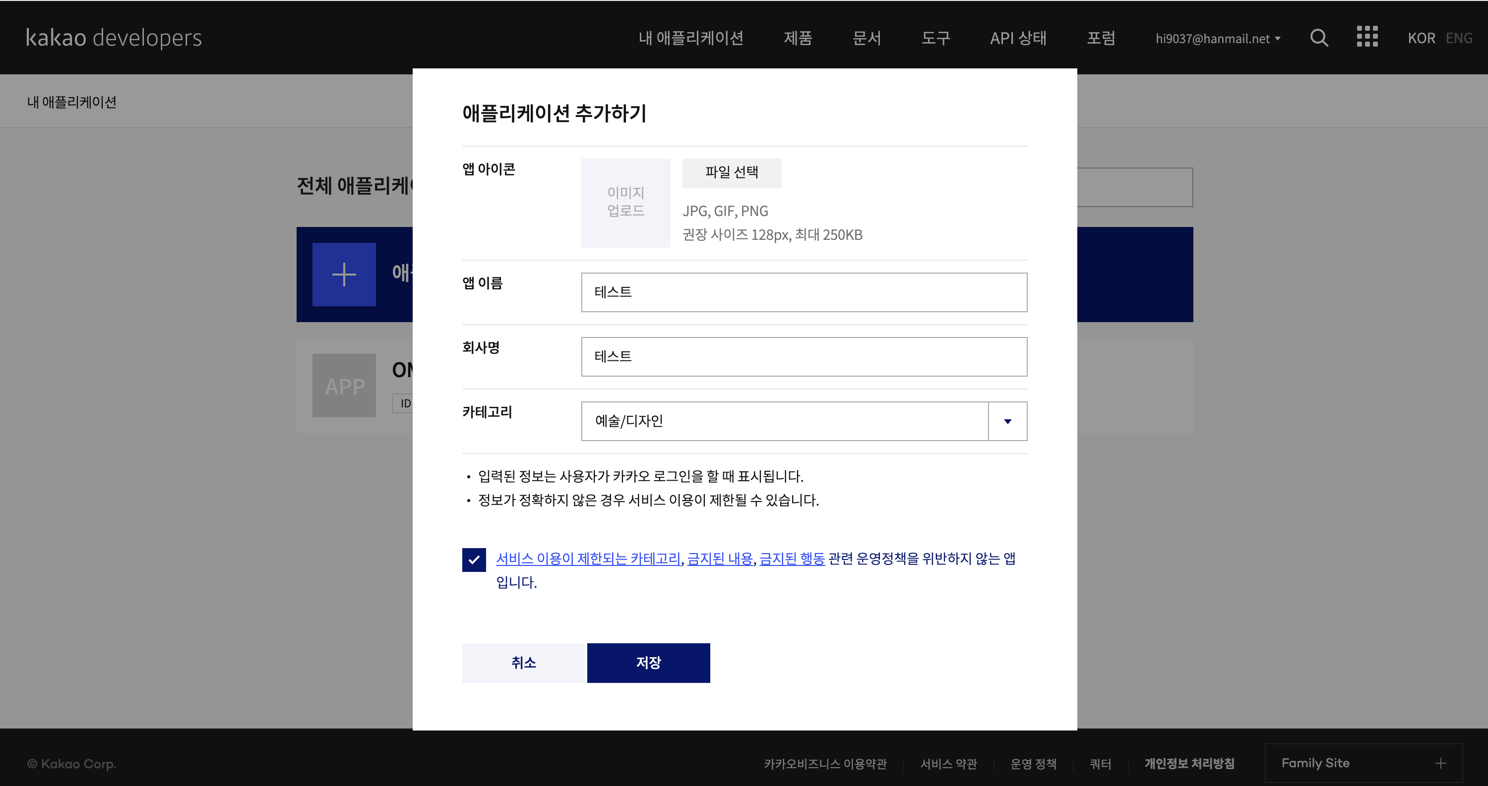 4. 앱이름, 회사명, 카테고리 정보를 입력하고, 체크박스를 체크한 뒤에 "저장"버튼을 누른다. (앱 아이콘 빼고 다 필수임)