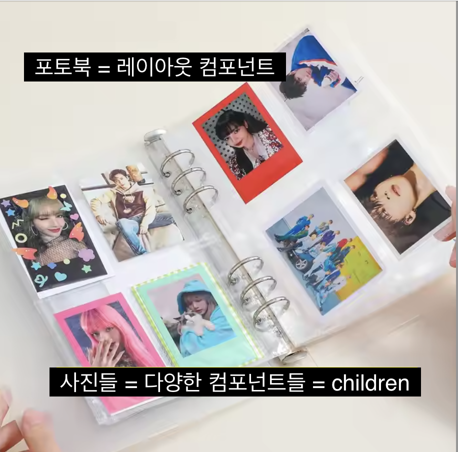 포토북 안에 다양한 앨범을 넣을 수 있듯이, children을 이용해서 하나의 레이아웃 컴포넌트 안에 다른 컴포넌트를 넣을 수 있게 되는 것이다.