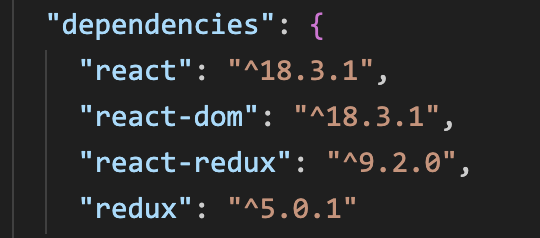 2. 설치하고 나면, package.json에 아래와 같이 react-redux가 의존성 목록(dependencies)에 추가된 것을 볼 수 있다.