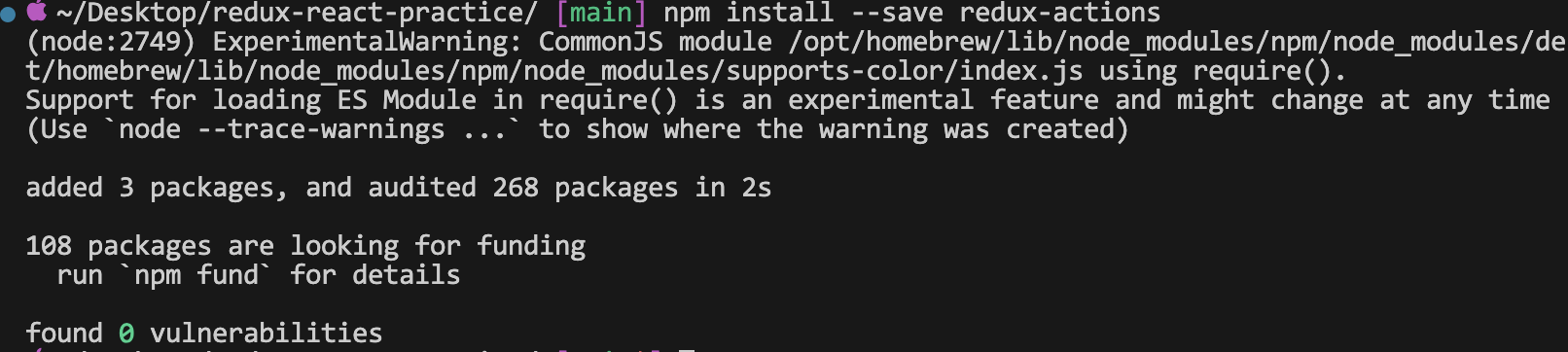 (1) 터미널에 명령어를 입력해서,redux actions 패키지를 설치한다.