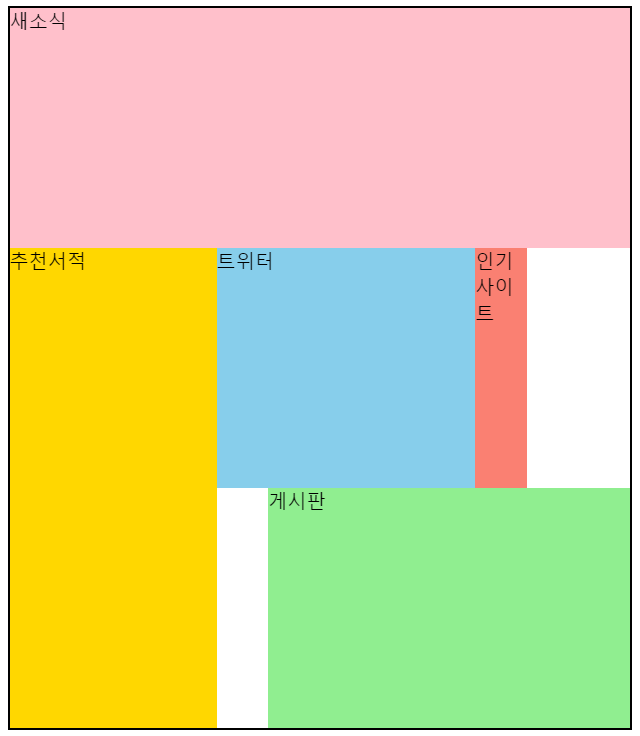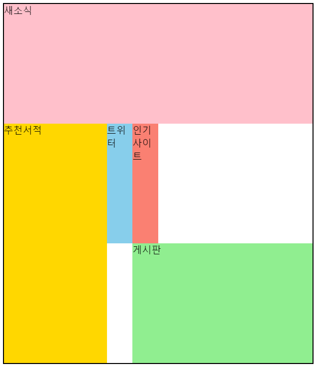 살몬색(인기사이트) 부분을 2-3번 행(row), 10~13번 열(column)에 배치한다.