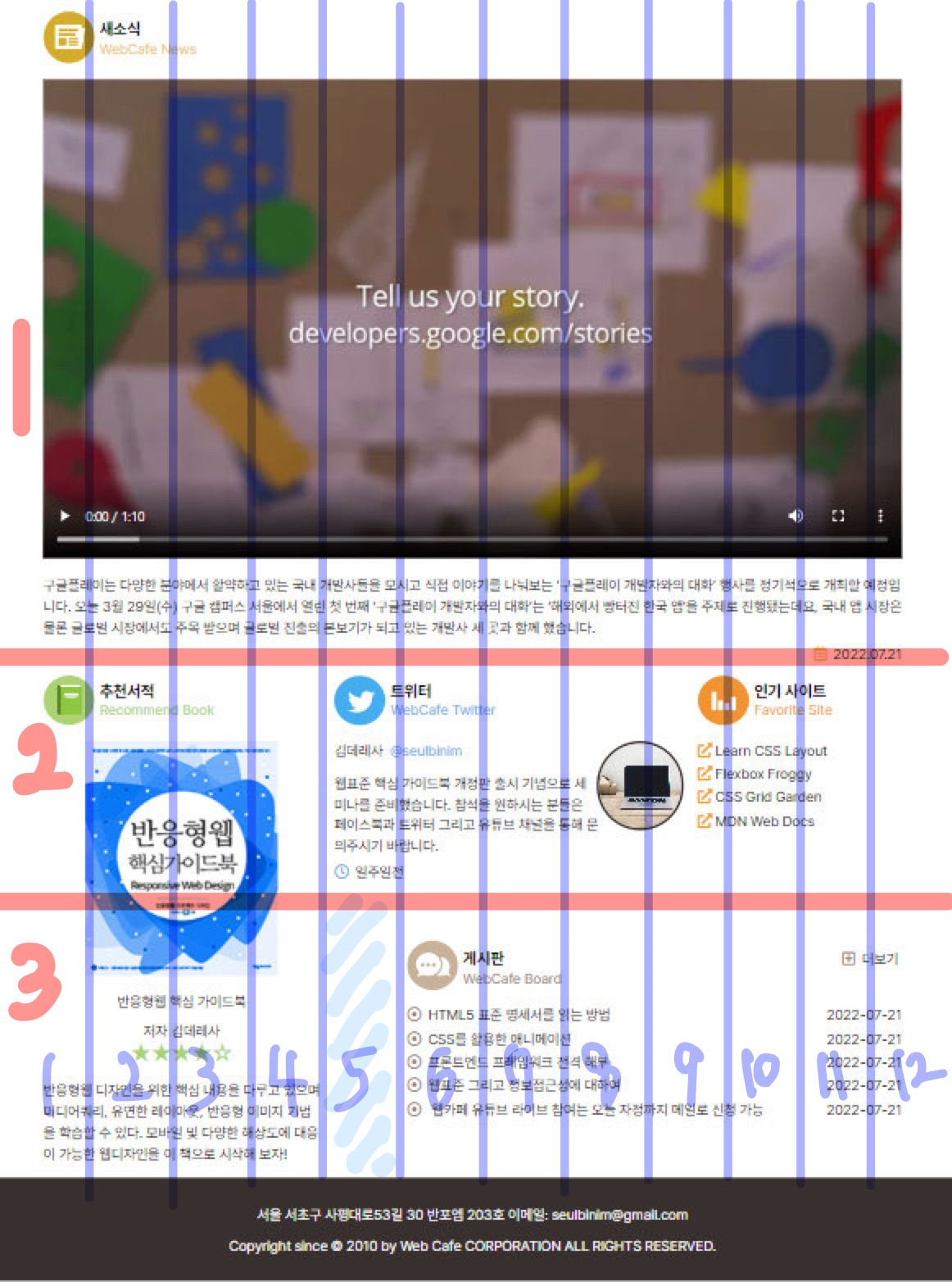 열은 추천서적과 게시판 사이의 여백(5번칸) 기준으로 쪼개니 12열로 나눠진다. (파란색)
