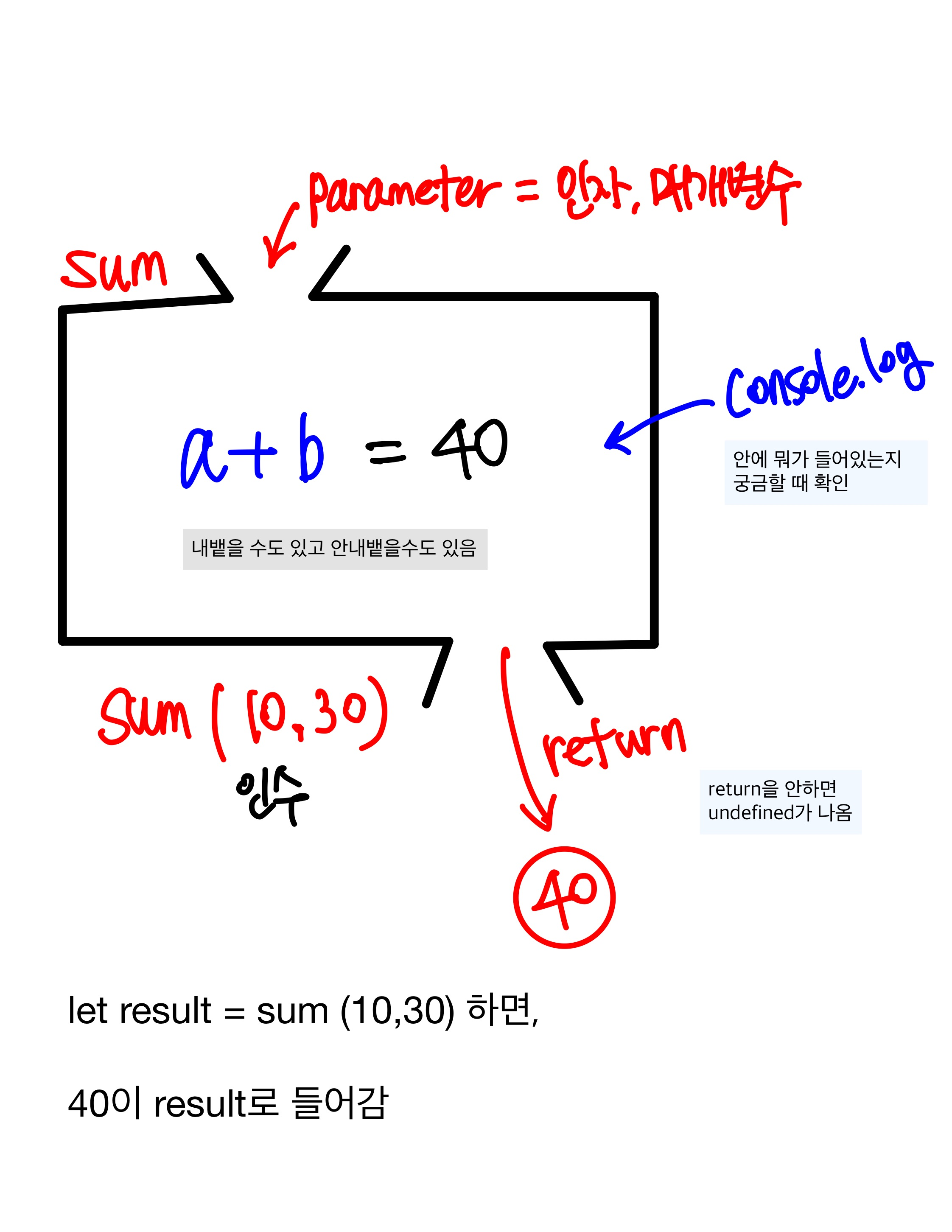 - sum이라는 이름의 함수는 매개변수 a, b를 지니고 a+b를 반환하는 함수이다.