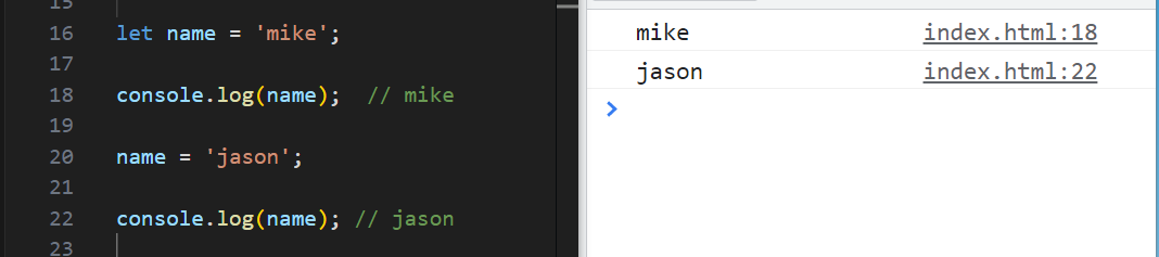 5. 밑에 출력부(console.log)를 만나면 값이 할당 된 이후라서 mike가 출력된다.