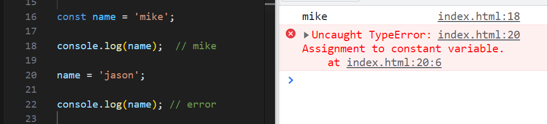 유일한 차이점이 있는데, const는 값의 할당을 동시에 해줘야하고 재할당이 불가하다는 점이다.