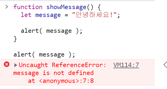 alert( message ); // ReferenceError: message is not defined (message는 함수 내 지역 변수이기 때문에 에러가 발생합니다.)