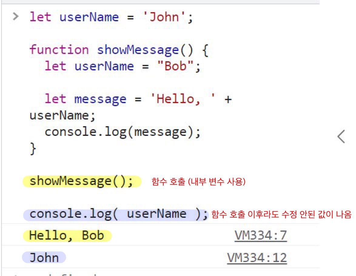 showMessage(); // Hello, Bob // 함수 호출 (내부 변수만 사용한다.)