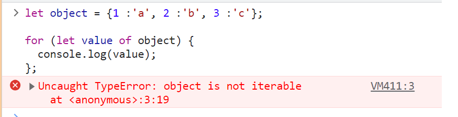 - [Symbol.iterator] 속성을 가지는 것들만을 대상으로 한다. 따라서 객체(iterable하지 않은 일반 Object)에 for...of를 사용하면 에러가 발생한다. - iterable객체의 value를 순회 |