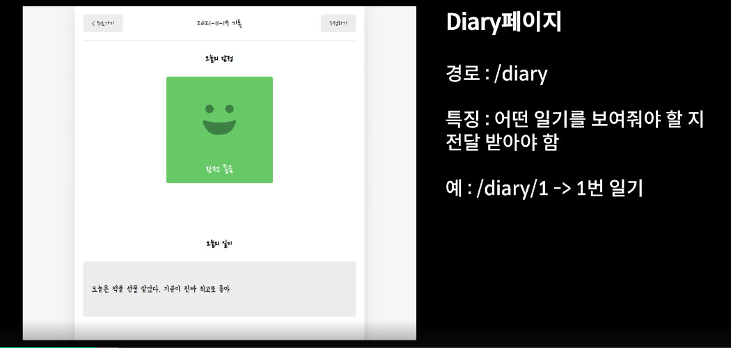 예컨대 일기 리스트들 중 1번 일기(상세페이지)로 가려면, diary안에 있는 (id가 1인) 1번 다이어리로 가게끔 경로를 설정해야한다.