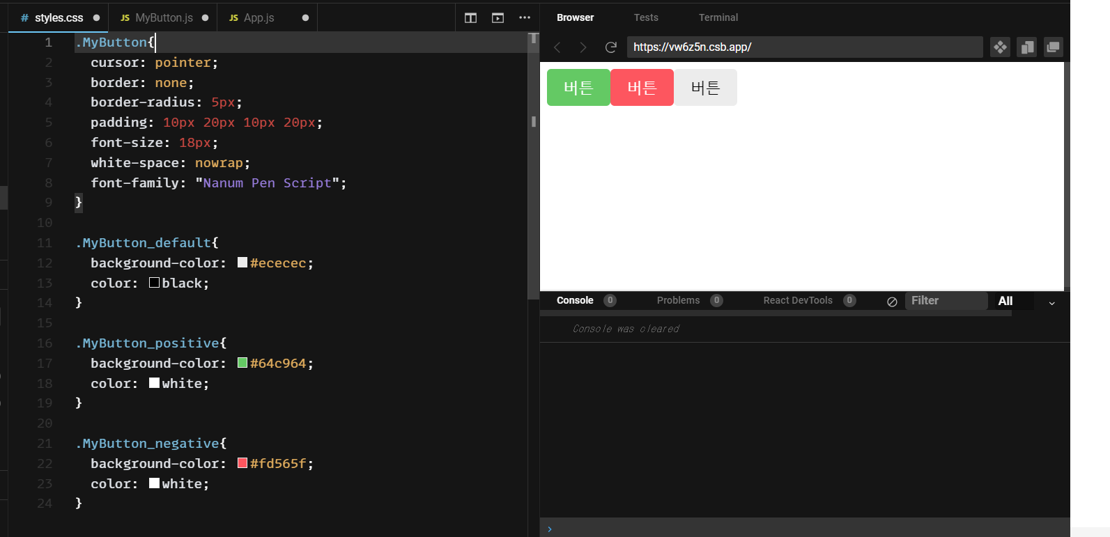 <MyButton text={"버튼"} onClick={()=>alert("버튼 클릭")} type={"positive"}/> //positive로 설정 돼있음