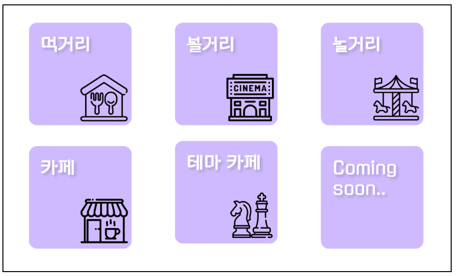메인페이지에는 먹거리, 볼거리, 놀거리, 카페, 테마카페가 있다.