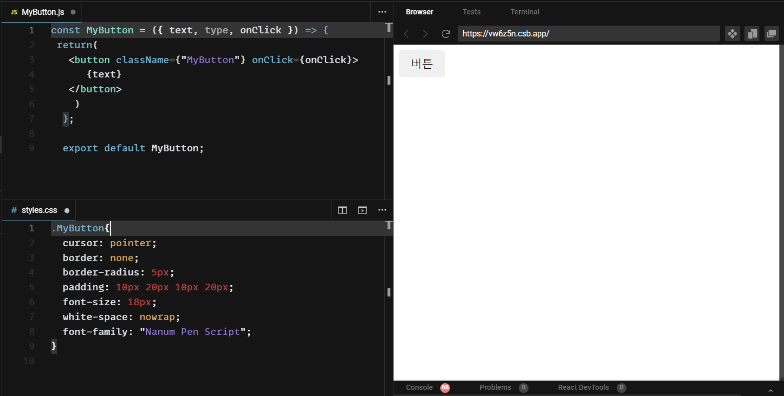 1. src/components 폴더 안에 MyButton.js 라는 파일(컴포넌트)을 생성한다.