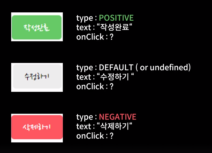 <MyButton text={"버튼"} onClick={()=>alert("버튼 클릭")} type={"positive"}/> //positive로 설정 돼있음